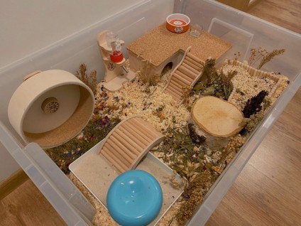• Gruba warstwa ściółki, najlepiej trociny niepylące, które można wymieszkać ze ściółką lnianą czy konopną. Chomiki uwielbiają kopać tunele, dlatego ściółki powinno być jak najwięcej. Przy sprzątaniu wskazane jest zostawienie ok 20%  starej ściółki, by zostawić zapach, dzięki czemu ograniczymy zwierzęciu stres.
